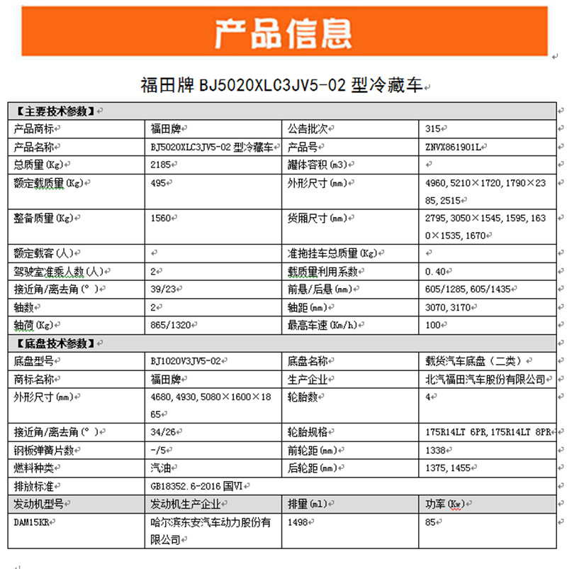 福田時代祥菱V冷藏車,1600車身,整車型號:BJ5020XLC3JV5-02,底盤型號:BJ1020V3JV5-02,整車尺寸:4960*1720*2515,箱體尺寸:2795*1545*1535,東安KAM15KR發(fā)動機,116馬力,5檔箱,DAT18R-5擋變速箱,總質(zhì)量:2185kg,整備質(zhì)量:1560kg,額定載質(zhì)量:495kg,3070軸距,175R14LT輪胎,102后橋,ABS,電動助力轉(zhuǎn)向、中控鎖,電動玻璃,、前穩(wěn)定桿、皮革座椅。